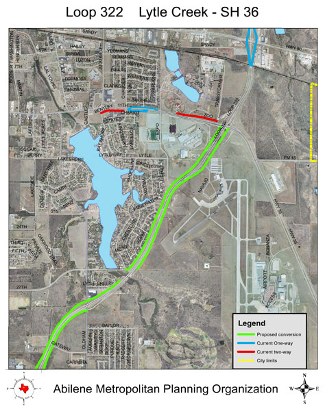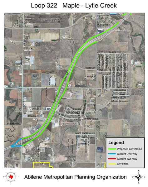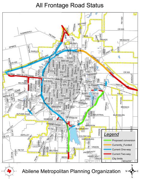 The Abilene MPO and the TxDOT Abilene District have combined their funding of the $2 billion allocated statewide to begin the process of converting the frontage roads in Abilene to one-way operation. In order to qualify for the funding, projects considered need to address needs in the areas of congestion, safety, maintenance, and connectivity.